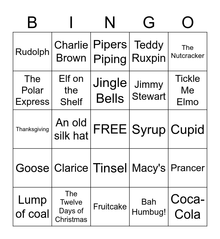 This bingo card has a free space and 24 words: Lump of coal, Clarice, Jingle Bells, Bah Humbug!, The Nutcracker, Rudolph, Charlie Brown, Pipers Piping, Syrup, Cupid, Thanksgiving, Elf on the Shelf, Macy's, Prancer, The Polar Express, The Twelve Days of Christmas, Fruitcake, Teddy Ruxpin, Tickle Me Elmo, Goose, An old silk hat, Tinsel, Jimmy Stewart and Coca-Cola.