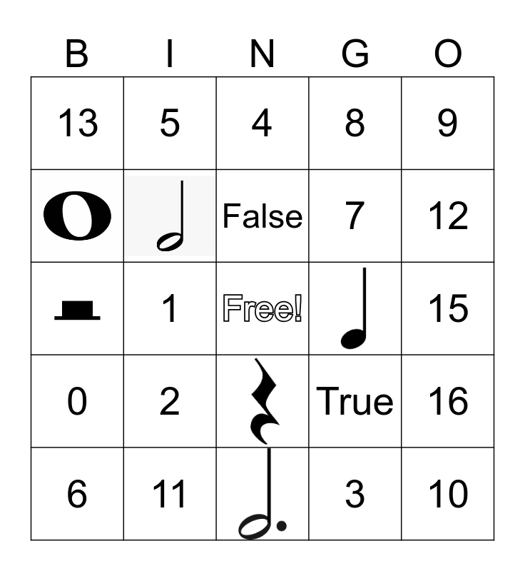 This bingo card has 6 images, a free space and 18 words: 2, 11, False, 6, 9, 13, 5, 7, True, 16, 3, 15, 4, 12, 1, 10, 0 and 8.