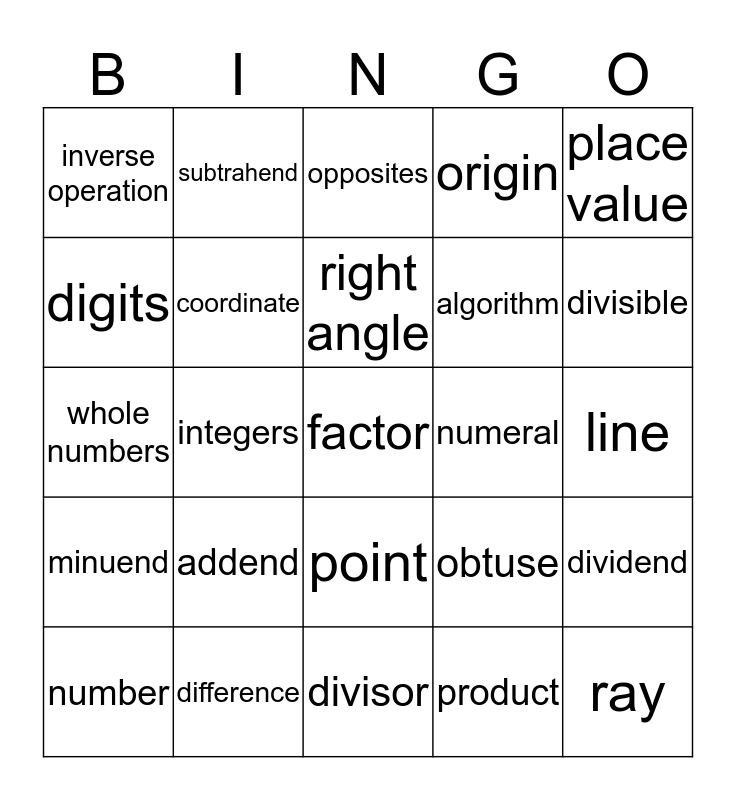 This bingo card has a free space and 24 words: addend, difference, right angle, number, place value, inverse operation, digits, subtrahend, numeral, point, algorithm, whole numbers, obtuse, dividend, coordinate, product, line, opposites, divisible, integers, ray, minuend, origin and divisor.