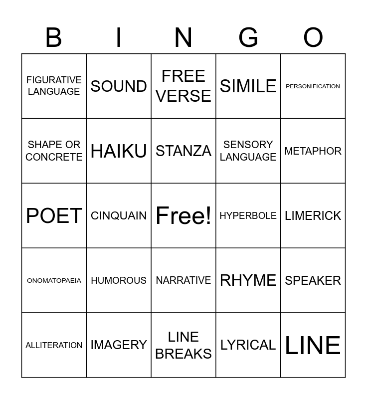 This bingo card has a free space and 29 words: ALLITERATION, BIO, CINQUAIN, DIAMANTE, FIGURATIVE LANGUAGE, FREE VERSE, HAIKU, HUMOROUS, HYPERBOLE, IMAGERY, LIMERICK, LINE, LINE BREAKS, LYRICAL, METAPHOR, MOOD, NARRATIVE, ONOMATOPAEIA, PERSONIFICATION, POET, RHYME, RHYTHM, SENSORY LANGUAGE, SHAPE OR CONCRETE, SIMILE, SOUND, SPEAKER, STANZA and THEME.