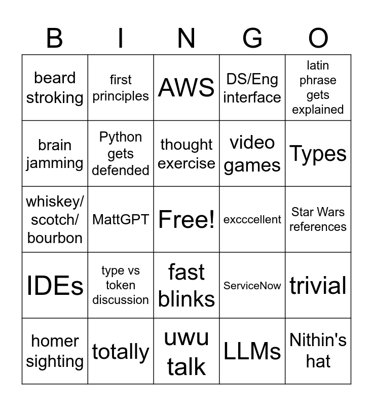 This bingo card has a free space and 24 words: type vs token discussion, totally, thought exercise, homer sighting, latin phrase gets explained, beard stroking, brain jamming, first principles, excccellent, fast blinks, video games, whiskey/ scotch/ bourbon, ServiceNow, trivial, Python gets defended, LLMs, Star Wars references, AWS, Types, MattGPT, Nithin's hat, IDEs, DS/Eng interface and uwu talk.