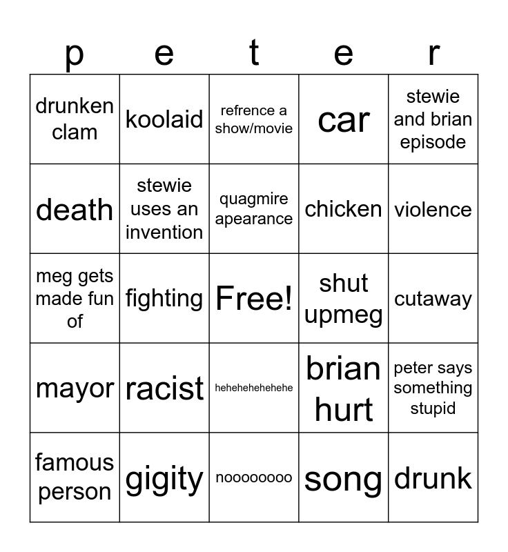 This bingo card has a free space and 24 words: racist, gigity, quagmire apearance, famous person, stewie and brian episode, drunken clam, death, koolaid, shut upmeg, hehehehehehehe, chicken, meg gets made fun of, brian hurt, peter says something stupid, stewie uses an invention, song, cutaway, refrence a show/movie, violence, fighting, drunk, mayor, car and noooooooo.