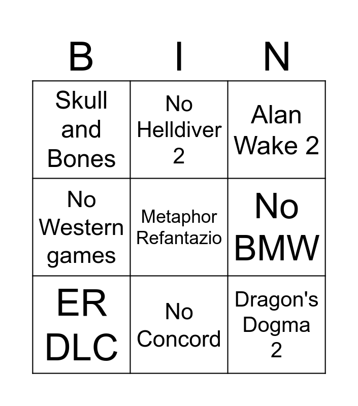 This bingo card has a free space and 8 words: No BMW, Alan Wake 2, No Helldiver 2, ER DLC, Skull and Bones, Dragon's Dogma 2, No Western games and No Concord.