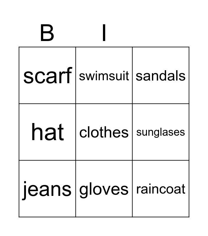 This bingo card has a free space and 8 words: sunglases, sandals, swimsuit, jeans, scarf, raincoat, hat and gloves.