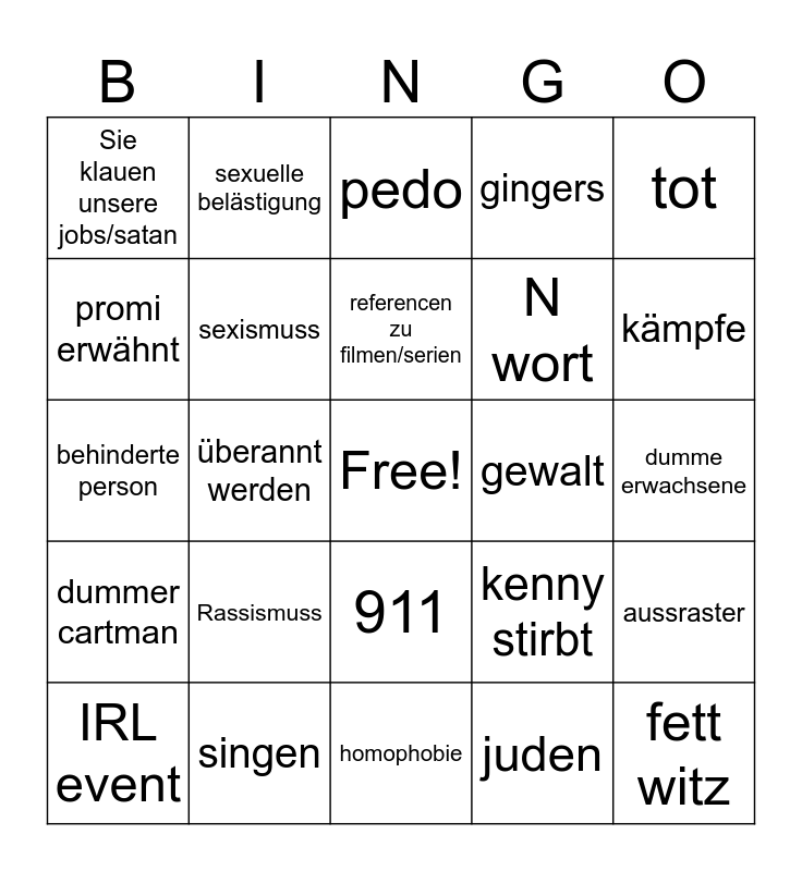 This bingo card has a free space and 24 words: Rassismuss, singen, referencen zu filmen/serien, IRL event, tot, Sie klauen unsere jobs/satan, promi erwähnt, sexuelle belästigung, gewalt, 911, N wort, behinderte person, kenny stirbt, aussraster, sexismuss, juden, dumme erwachsene, pedo, kämpfe, überannt werden, fett witz, dummer cartman, gingers and homophobie.