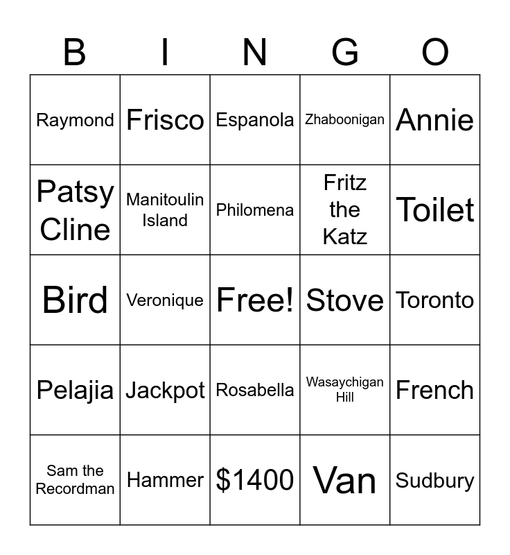 This bingo card has a free space and 36 words: Rez, Sisters, Tomson Highway, Manitoulin Island, Wasaychigan Hill, Pelajia, Philomena, Marie-Adele, Annie, Emily, Veronique, Zhaboonigan, Nanabush, Stove, Toilet, Raymond, Big Joey, Jackpot, Sudbury, Espanola, Toronto, French, Hammer, Sam the Recordman, $1400, Frisco, Bird, Silver Dollar, Fritz the Katz, Patsy Cline, Crazy, Anchor Inn, Van, Rosabella, Money and Prize.