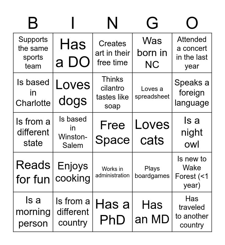 This bingo card has a free space and 24 words: Is a morning person, Enjoys cooking, Thinks cilantro tastes like soap, Has an MD, Attended a concert in the last year, Supports the same sports team, Has a DO, Creates art in their free time, Loves cats, Is a night owl, Is from a different state, Loves dogs, Plays boardgames, Is new to Wake Forest (<1 year), Is based in Charlotte, Is from a different country, Has a PhD, Was born in NC, Speaks a foreign language, Reads for fun, Is based in Winston-Salem, Works in administration, Loves a spreadsheet and Has traveled to another country.