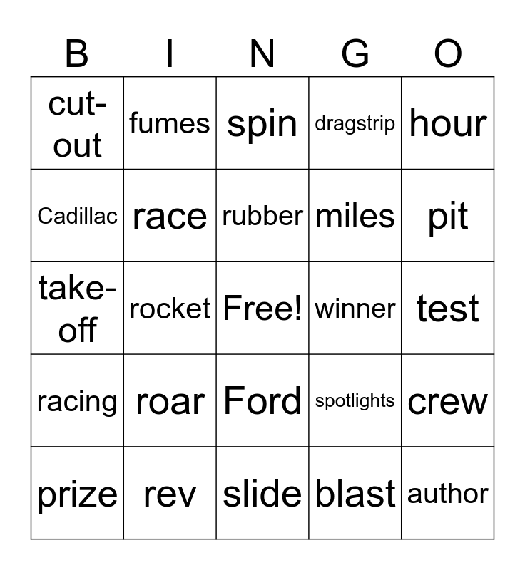 This bingo card has a free space and 24 words: prize, roar, rubber, blast, hour, cut-out, fumes, spin, winner, test, take-off, race, spotlights, crew, Cadillac, rev, slide, dragstrip, pit, racing, rocket, Ford, miles and author.