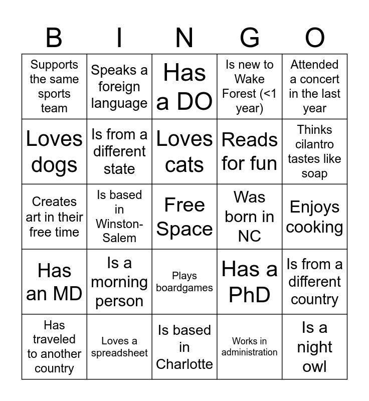 This bingo card has a free space and 24 words: Has traveled to another country, Is a morning person, Loves cats, Works in administration, Attended a concert in the last year, Supports the same sports team, Speaks a foreign language, Has a DO, Was born in NC, Enjoys cooking, Creates art in their free time, Is from a different state, Has a PhD, Is from a different country, Loves dogs, Loves a spreadsheet, Is based in Charlotte, Is new to Wake Forest (<1 year), Thinks cilantro tastes like soap, Has an MD, Is based in Winston-Salem, Plays boardgames, Reads for fun and Is a night owl.