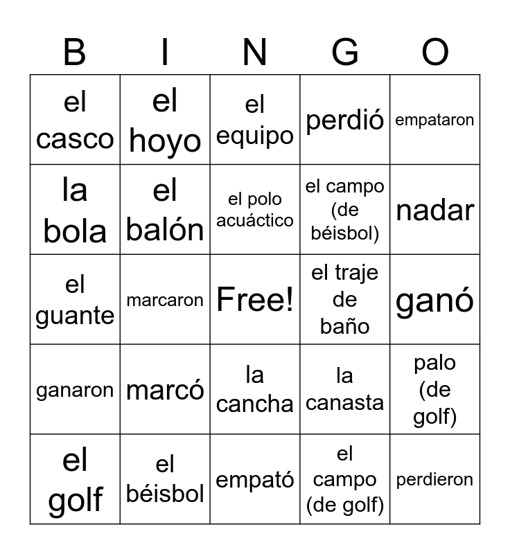 This bingo card has a free space and 36 words: driblar, tiro de tres, pase, el balón, la canasta, ganaron, el polo acuáctico, los bases, empataron, el partido, marcaron, perdió, el bate, el traje de baño, nadar, el casco, la piscina, marcó, perdieron, el equipo, ganó, palo (de golf), el béisbol, el golf, empató, el hoyo, el guante, el tenis, el campo (de béisbol), la bola, la pelota, los botines, el campo (de golf), la cancha, las zapatillas and la raqueta.