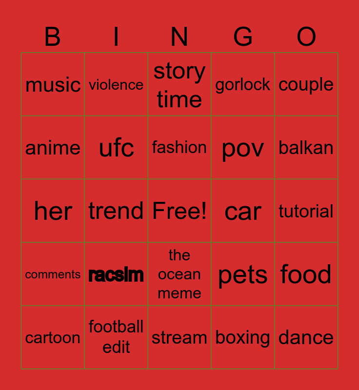 This bingo card has a free space and 24 words: racsim, football edit, fashion, cartoon, couple, music, anime, violence, car, the ocean meme, pov, her, pets, food, ufc, boxing, tutorial, story time, balkan, trend, dance, comments, gorlock and stream.
