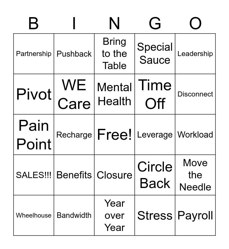 This bingo card has a free space and 27 words: Circle Back, Bandwidth, Time Off, Year over Year, Pivot, Bring to the Table, Pushback, SALES!!!, Leverage, Move the Needle, Pain Point, Special Sauce, Wheelhouse, Bandwidth, Disconnect, #Lucrew, WE Care, Mental Health, Benefits, Partnership, Workload, Stress, Recharge, Payroll, Closure, Leadership and Fireside Chats.