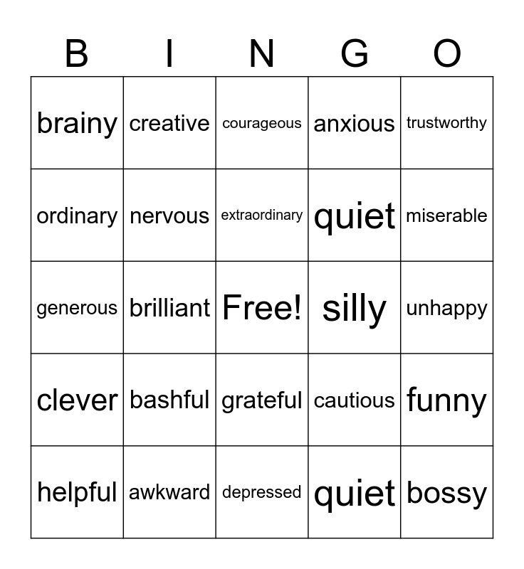 This bingo card has a free space and 29 words: helpful, petrified, brilliant, friendly, brainy, courageous, nervous, bashful, silly, awkward, unhappy, bossy, depressed, quiet, miserable, brave, grateful, clever, trustworthy, generous, cautious, insecure, quiet, ordinary, anxious, creative, funny, extraordinary and quiet.