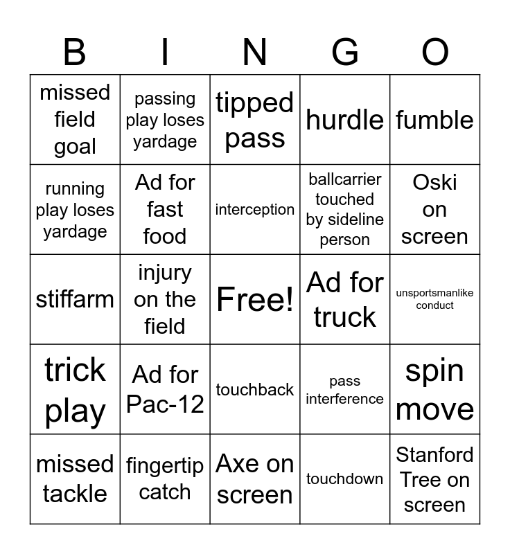This bingo card has a free space and 26 words: touchback, touchdown, interception, fingertip catch, fumble, missed field goal, running play loses yardage, passing play loses yardage, unsportsmanlike conduct, pass interference, ballcarrier touched by sideline person, stiffarm, spin move, missed tackle, injury on the field, coach throws headset, hurdle, trick play, tipped pass, Stanford Tree on screen, Oski on screen, Axe on screen, Ad for truck, Ad for Pac-12, Ad for fast food and Drug ad.