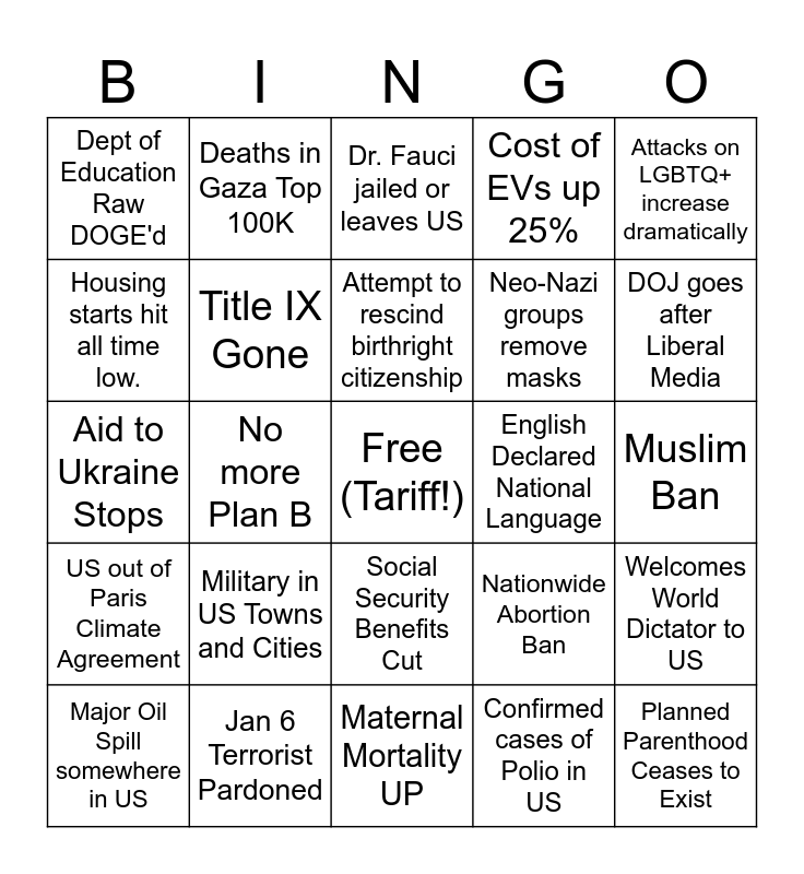 This bingo card has a free space and 24 words: Military in US Towns and Cities, Jan 6 Terrorist Pardoned, Attempt to rescind birthright citizenship, Major Oil Spill somewhere in US, Attacks on LGBTQ+ increase dramatically, Dept of Education Raw DOGE'd, Housing starts hit all time low., Deaths in Gaza Top 100K, English Declared National Language, Social Security Benefits Cut, Neo-Nazi groups remove masks, Aid to Ukraine Stops, Nationwide Abortion Ban, Welcomes World Dictator to US, Title IX Gone, Confirmed cases of Polio in US, Muslim Ban, Dr. Fauci jailed or leaves US, DOJ goes after Liberal Media, No more Plan B, Planned Parenthood Ceases to Exist, US out of Paris Climate Agreement, Cost of EVs up 25% and Maternal Mortality UP.
