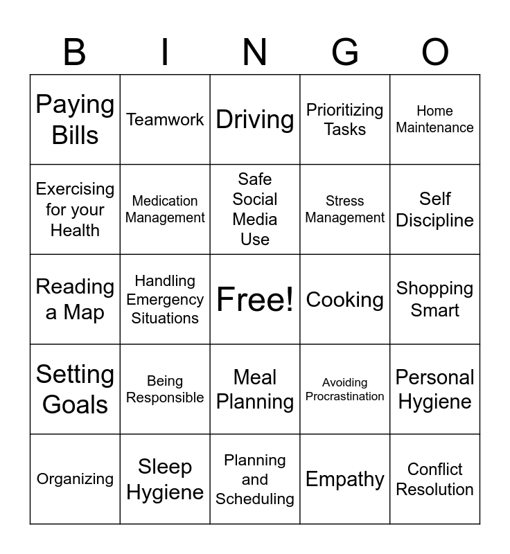 This bingo card has a free space and 54 words: Budgeting Money, Setting Goals, Active Listening, Eating Healthy, Meal Planning, Saving Money, Prioritizing Tasks, Assertiveness, Exercising for your Health, Cleaning, Paying Bills, Meeting Deadlines, Sleep Hygiene, Organizing, Understanding Credit, Planning and Scheduling, Conflict Resolution, Stress Management, Laundry, Shopping Smart, Avoiding Procrastination, Public Speaking, Cooking, Home Maintenance, Professionalism, Teamwork, Problem-solving, Networking, Adaptability, Empathy, Sympathy, Kindness, Respecting Boundaries, Building Relationships, Driving, Using Public Transportation, Reading a Map, Personal Hygiene, Oral Hygiene, Medication Management, Dressing Appropriately, Self Advocacy, Recognizing Problems, Creative Thinking, Being Responsible, Making Good Choices, Weighing Pros and Cons, Internet Navigation, Safe Social Media Use, Handling Emergency Situations, Self Discipline, Emotional Regulation, Anger Management Strategies and Email writing.