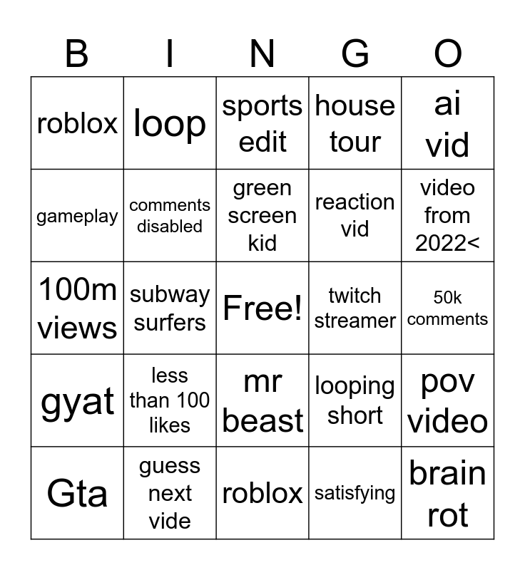 This bingo card has a free space and 24 words: less than 100 likes, guess next vide, green screen kid, Gta, ai vid, roblox, gameplay, loop, twitch streamer, mr beast, reaction vid, 100m views, looping short, pov video, comments disabled, satisfying, 50k comments, sports edit, video from 2022<, subway surfers, brain rot, gyat, house tour and roblox.