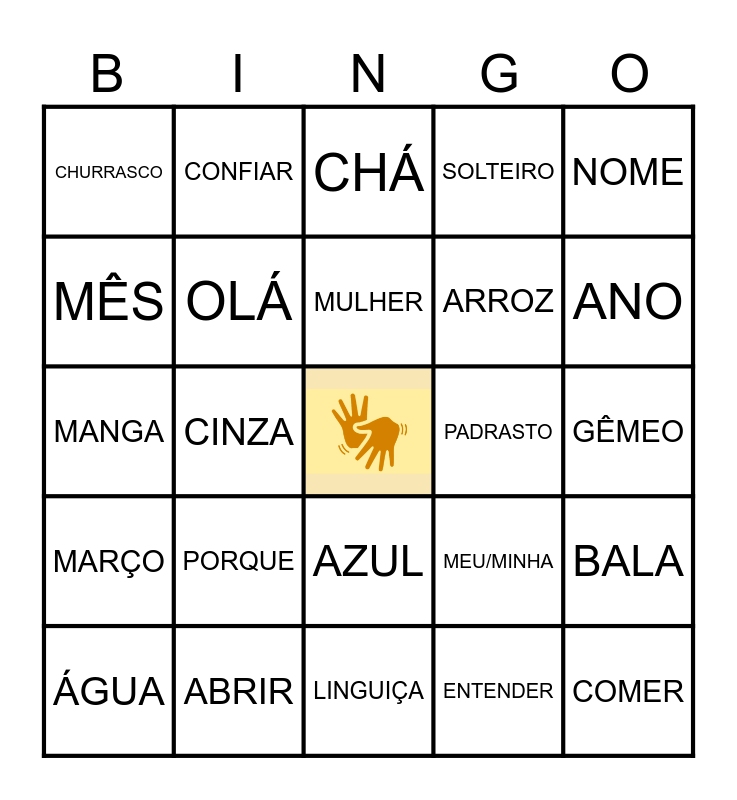 This bingo card has a free space and 24 words: PORQUE, ABRIR, MULHER, ÁGUA, NOME, CHURRASCO, MÊS, CONFIAR, PADRASTO, AZUL, ARROZ, MANGA, MEU/MINHA, BALA, OLÁ, ENTENDER, GÊMEO, CHÁ, ANO, CINZA, COMER, MARÇO, SOLTEIRO and LINGUIÇA.