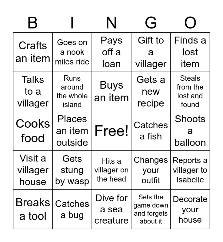 This bingo card has a free space and 24 words: Gets stung by wasp, Catches a bug, Buys an item, Breaks a tool, Finds a lost item, Crafts an item, Talks to a villager, Goes on a nook miles ride, Catches a fish, Hits a villager on the head, Gets a new recipe, Cooks food, Changes your outfit, Reports a villager to Isabelle, Runs around the whole island, Sets the game down and forgets about it, Shoots a balloon, Pays off a loan, Steals from the lost and found, Places an item outside, Decorate your house, Visit a villager house, Gift to a villager and Dive for a sea creature.