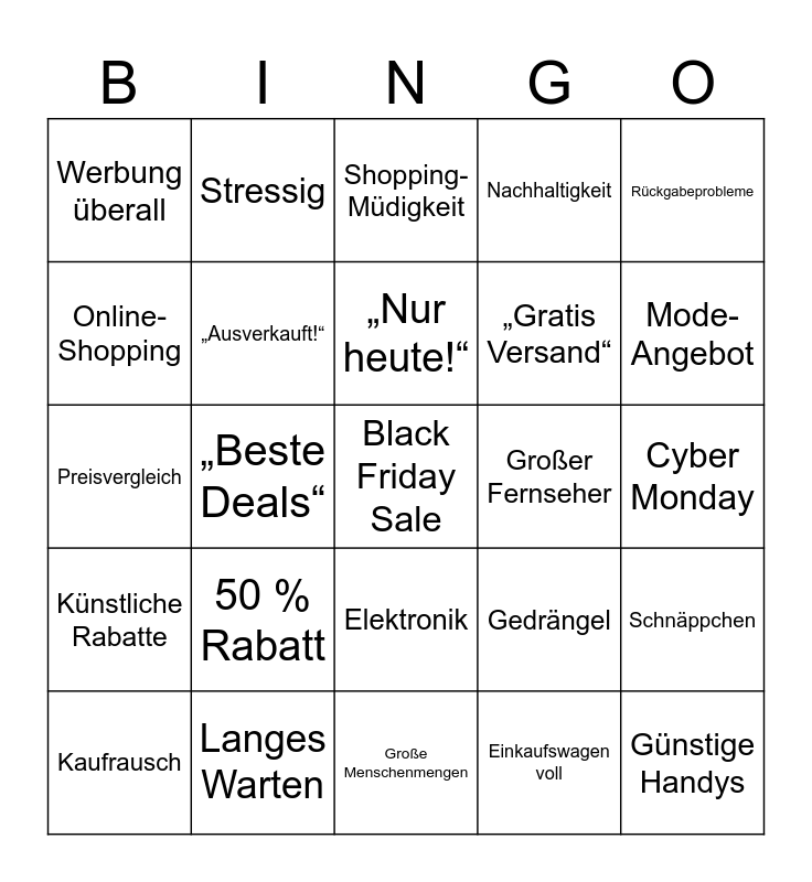 This bingo card has a free space and 24 words: 50 % Rabatt, Langes Warten, „Nur heute!“, Kaufrausch, Rückgabeprobleme, Werbung überall, Online-Shopping, Stressig, Großer Fernseher, Elektronik, „Gratis Versand“, Preisvergleich, Gedrängel, Schnäppchen, „Ausverkauft!“, Einkaufswagen voll, Cyber Monday, Shopping-Müdigkeit, Mode-Angebot, „Beste Deals“, Günstige Handys, Künstliche Rabatte, Nachhaltigkeit and Große Menschenmengen.