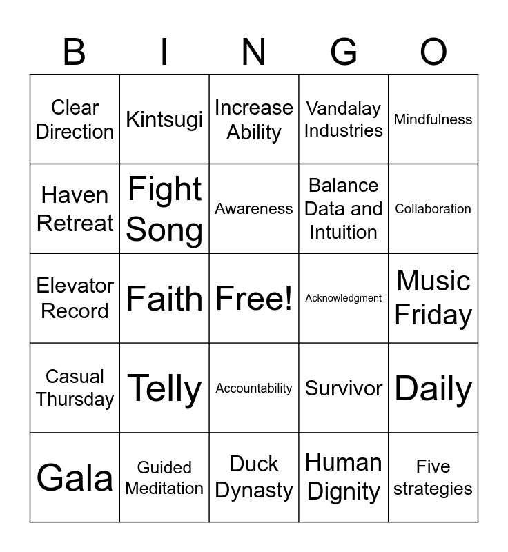 This bingo card has a free space and 50 words: Convention, Five strategies, Red Lipstick, Duck Dynasty, Telly, Three Practices, Kintsugi, Defend Innocence, Haven Retreat, Finding Hope, Fight Song, Vandalay Industries, Daily, Survivor, Luminaria, Reclaim Hope, Awareness, Acknowledgment, Power through Surrender, Mindfulness, Faith, Human Dignity, Clear Direction, Balance Data and Intuition, Unselfish Leadership, Align with the Board, Collaboration, Organization, Increase Ability, Accountability, North Star, Theory of Change, The Younique Foundation, Vision Board, Guided Meditation, Muay Thai, Assertive Communication, March Madness, Pedagogy, Music Friday, 36 terabytes, Treat Tuesdays, Monday Mixers, Family Photos, Gala, Elevator Record, Snake Wrangler, Swig Run, Casual Thursday and Selfie Record.