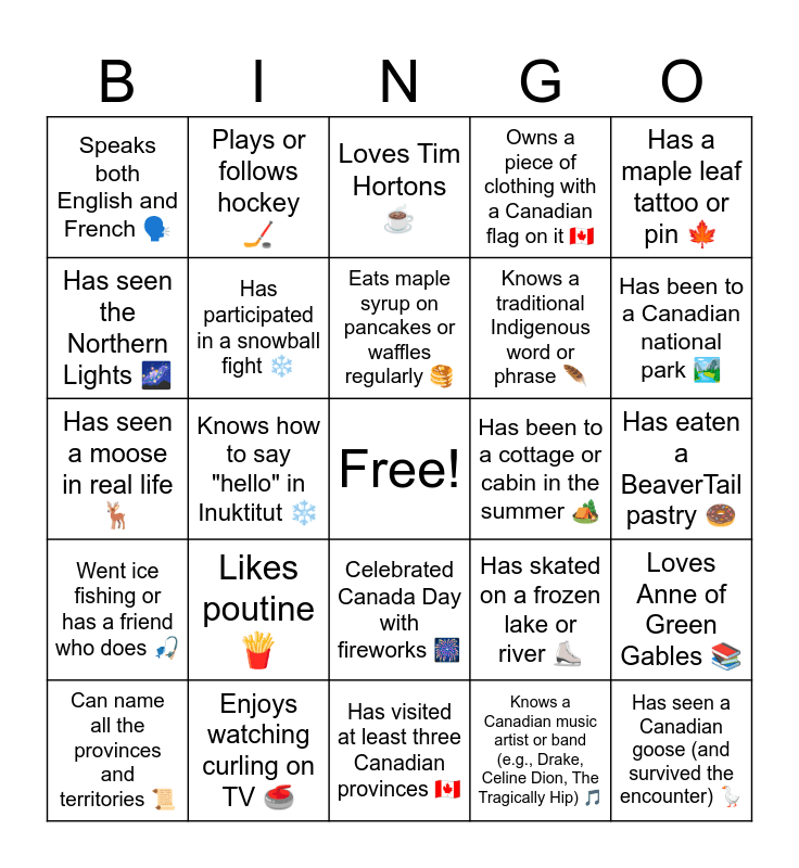 This bingo card has a free space and 25 words: Likes poutine π, Has visited at least three Canadian provinces π¨π¦, Eats maple syrup on pancakes or waffles regularly π₯, Can name all the provinces and territories π, Has a maple leaf tattoo or pin π, Speaks both English and French π£οΈ, Has seen the Northern Lights π, Plays or follows hockey π, Has been to a cottage or cabin in the summer ποΈ, Celebrated Canada Day with fireworks π, Knows a traditional Indigenous word or phrase πͺΆ, Has seen a moose in real life π¦, Has skated on a frozen lake or river βΈοΈ, Loves Anne of Green Gables π, Has participated in a snowball fight βοΈ, Can sing the Canadian national anthem in both languages π€, Has eaten a BeaverTail pastry π©, Loves Tim Hortons β, Has been to a Canadian national park ποΈ, Knows how to say "hello" in Inuktitut βοΈ, Has seen a Canadian goose (and survived the encounter) πͺΏ, Enjoys watching curling on TV π₯, Went ice fishing or has a friend who does π£, Owns a piece of clothing with a Canadian flag on it π¨π¦ and Knows a Canadian music artist or band (e.g., Drake, Celine Dion, The Tragically Hip) π΅.