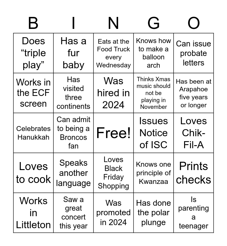 This bingo card has a free space and 25 words: Speaks another language, Was promoted in 2024, Was hired in 2024, Works in Littleton, Can issue probate letters, Does “triple play”, Works in the ECF screen, Has a fur baby, Issues Notice of ISC, Loves Black Friday Shopping, Thinks Xmas music should not be playing in November, Celebrates Hanukkah, Knows one principle of Kwanzaa, Prints checks, Has visited three continents, Can check people in at Jury, Loves Chik-Fil-A, Eats at the Food Truck every Wednesday, Has been at Arapahoe five years or longer, Can admit to being a Broncos fan, Is parenting a teenager, Saw a great concert this year, Loves to cook, Knows how to make a balloon arch and Has done the polar plunge.