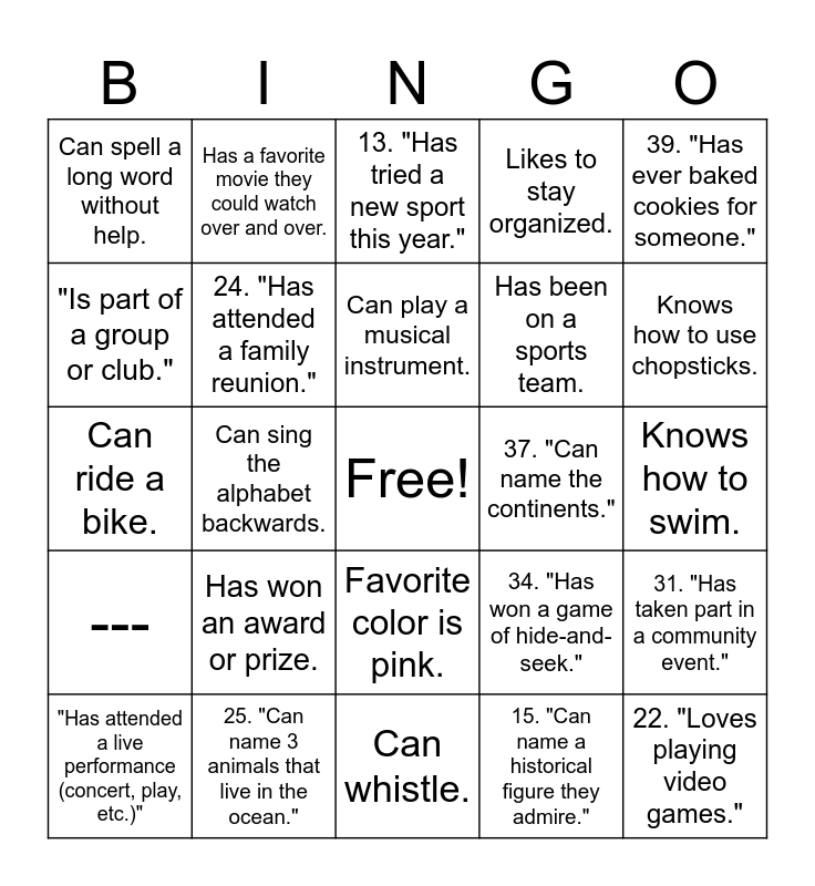 This bingo card has a free space and 98 words: Has a nickname., Has been to the beach this year., Can name all the planets in our solar system., Knows how to swim., Has a favorite quote., Has a talent in singing or music., Has been to another country., Likes to play board games., Has a pet., Has a favorite hobby they do every week., Can make their own bed., Has met someone famous., Is learning to play an instrument., Has won an award or prize., Loves animals., Has a favorite movie they could watch over and over., Can ride a bike., Has an older sibling., Is the oldest child in their family., Has a favorite book they recommend to others., Likes to sing in the shower., Knows how to do a dance move., Has a dream job they want when they grow up., Loves to cook or bake with family., Knows how to play a sport.", Can spell a long word without help., Can whistle., Loves spending time outdoors., Can draw a picture of something., "Is a morning person.", "Has attended a live performance (concert, play, etc.)", "Is part of a group or club.", "Has tried a new food this year.", Has an unusual talent., Knows how to use chopsticks., Loves helping others., Likes to stay organized., Has a favorite dance style., Can sing the alphabet backwards., Knows a fun fact about animals., Has a younger sibling., Can play a musical instrument., Has been on a sports team., Loves to draw or paint., Knows how to cook or bake., Favorite color is pink., Has volunteered before., Loves reading books., Speaks more than one language., Has traveled to another state., Can name three positive traits about themselves., Knows a fun fact about history., Can recite an affirmation., Favorite subject is science., Loves to dance., Here are **additional prompts** for your **Human Bingo** game, so you have even more variety to choose from. I've included a mix of fun, reflective, and light-hearted prompts that align with the themes of the conference., ---, ### **Even More Human Bingo Prompts**, 1. "Has a favorite superhero.", 2. "Knows how to tie a bowtie.", 3. "Can do a cartwheel.", 4. "Can speak a phrase in another language.", 5. "Likes to collect something (stamps, coins, etc.).", 6. "Can name all the seasons.", 7. "Has gone camping.", 8. "Has a favorite TikTok trend.", 9. "Knows how to knit or crochet.", 10. "Can name 5 countries.", 11. "Likes to bake desserts.", 12. "Can juggle.", 13. "Has tried a new sport this year.", 14. "Can name their ancestors or family origins.", 15. "Can name a historical figure they admire.", 16. "Is passionate about an environmental cause.", 17. "Has gone on a road trip.", 18. "Has a favorite family tradition.", 19. "Knows how to change a tire.", 20. "Has a favorite childhood game.", 21. "Can recite a poem.", 22. "Loves playing video games.", 23. "Can swim in the deep end.", 24. "Has attended a family reunion.", 25. "Can name 3 animals that live in the ocean.", 26. "Has a collection of books.", 27. "Has watched a movie more than 5 times.", 28. "Can read in the dark.", 29. "Has attended a summer camp.", 30. "Can describe their perfect day.", 31. "Has taken part in a community event.", 32. "Loves to make cards or gifts for others.", 33. "Has a favorite character from a book.", 34. "Has won a game of hide-and-seek.", 35. "Has a favorite YouTube channel.", 36. "Has done a random act of kindness.", 37. "Can name the continents.", 38. "Has an older cousin.", 39. "Has ever baked cookies for someone." and 40. "Can name a planet other than Earth..