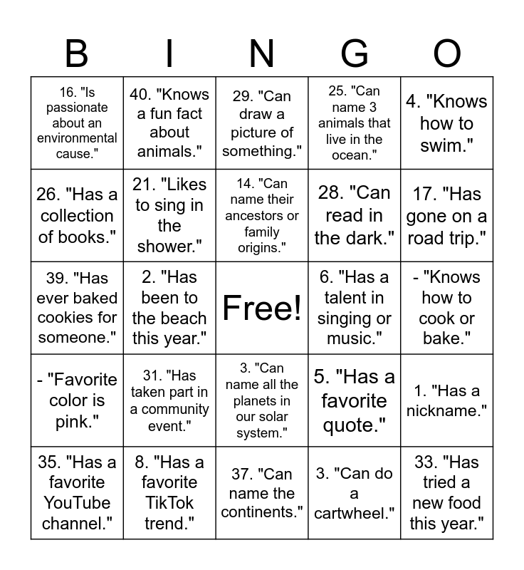 This bingo card has a free space and 95 words: 1. "Has a favorite superhero.", 2. "Knows how to tie a bowtie.", 3. "Can do a cartwheel.", 4. "Can speak a phrase in another language.", 5. "Likes to collect something (stamps, coins, etc.).", 6. "Can name all the seasons.", 7. "Has gone camping.", 8. "Has a favorite TikTok trend.", 9. "Knows how to knit or crochet.", 10. "Can name 5 countries.", 11. "Likes to bake desserts.", 12. "Can juggle.", 13. "Has tried a new sport this year.", 14. "Can name their ancestors or family origins.", 15. "Can name a historical figure they admire.", 16. "Is passionate about an environmental cause.", 17. "Has gone on a road trip.", 18. "Has a favorite family tradition.", 19. "Knows how to change a tire.", 20. "Has a favorite childhood game.", 21. "Can recite a poem.", 22. "Loves playing video games.", 23. "Can swim in the deep end.", 24. "Has attended a family reunion.", 25. "Can name 3 animals that live in the ocean.", 26. "Has a collection of books.", 27. "Has watched a movie more than 5 times.", 28. "Can read in the dark.", 29. "Has attended a summer camp.", 30. "Can describe their perfect day.", 31. "Has taken part in a community event.", 32. "Loves to make cards or gifts for others.", 33. "Has a favorite character from a book.", 34. "Has won a game of hide-and-seek.", 35. "Has a favorite YouTube channel.", 36. "Has done a random act of kindness.", 37. "Can name the continents.", 38. "Has an older cousin.", 39. "Has ever baked cookies for someone.", 40. "Can name a planet other than Earth.", 1. "Has a nickname.", 2. "Has been to the beach this year.", 3. "Can name all the planets in our solar system.", 4. "Knows how to swim.", 5. "Has a favorite quote.", 6. "Has a talent in singing or music.", 7. "Has been to another country.", 8. "Likes to play board games.", 9. "Has a pet.", 10. "Has a favorite hobby they do every week.", 11. "Can make their own bed.", 12. "Has met someone famous.", 13. "Is learning to play an instrument.", 14. "Has won an award or prize.", 15. "Loves animals.", 16. "Has a favorite movie they could watch over and over.", 17. "Can ride a bike.", 18. "Has an older sibling.", 19. "Is the oldest child in their family.", 20. "Has a favorite book they recommend to others.", 21. "Likes to sing in the shower.", 22. "Knows how to do a dance move.", 23. "Has a dream job they want when they grow up.", 24. "Loves to cook or bake with family.", 25. "Knows how to play a sport.", 26. "Can spell a long word without help.", 27. "Can whistle.", 28. "Loves spending time outdoors.", 29. "Can draw a picture of something.", 30. "Is a morning person.", 31. "Has attended a live performance (concert, play, etc.)", 32. "Is part of a group or club.", 33. "Has tried a new food this year.", 34. "Has an unusual talent.", 35. "Knows how to use chopsticks.", 36. "Loves helping others.", 37. "Likes to stay organized.", 38. "Has a favorite dance style.", 39. "Can sing the alphabet backwards.", 40. "Knows a fun fact about animals.", - "Has a younger sibling.", - "Can play a musical instrument.", - "Has been on a sports team.", - "Loves to draw or paint.", - "Knows how to cook or bake.", - "Favorite color is pink.", - "Has volunteered before.", - "Loves reading books.", - "Speaks more than one language.", - "Has traveled to another state.", - "Can name three positive traits about themselves.", - "Knows a fun fact about history.", - "Can recite an affirmation.", - "Favorite subject is science." and - "Loves to dance.".