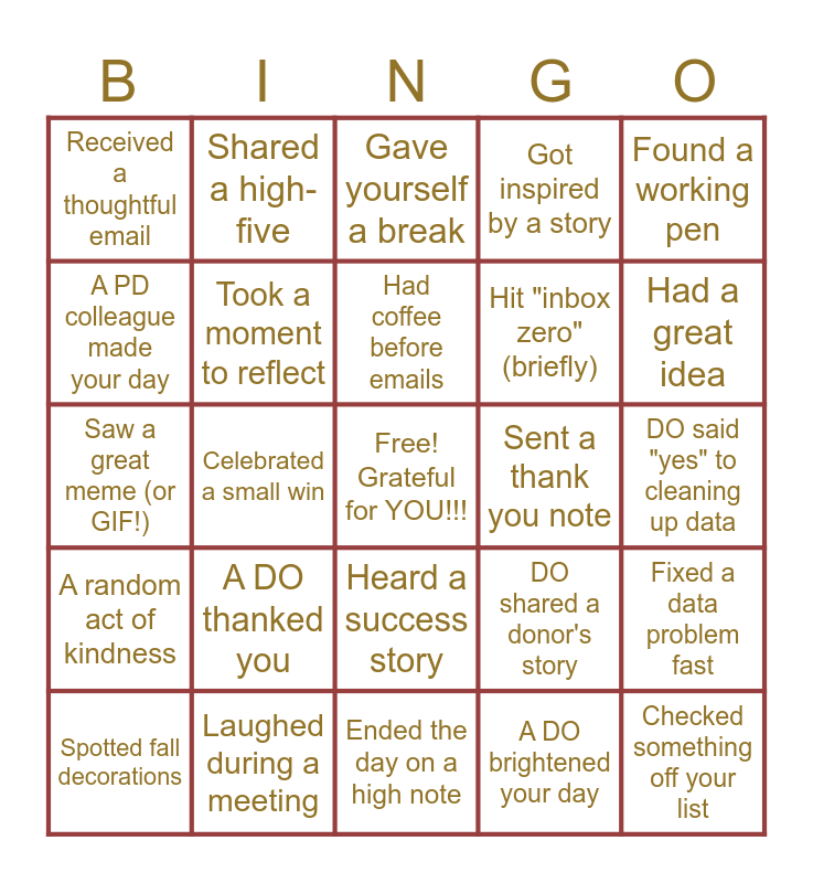 This bingo card has a free space and 24 words: A DO thanked you, Laughed during a meeting, Had coffee before emails, Spotted fall decorations, Found a working pen, Received a thoughtful email, A PD colleague made your day, Shared a high-five, Sent a thank you note, Heard a success story, Hit "inbox zero" (briefly), Saw a great meme (or GIF!), DO shared a donor's story, Fixed a data problem fast, Took a moment to reflect, A DO brightened your day, DO said "yes" to cleaning up data, Gave yourself a break, Had a great idea, Celebrated a small win, Checked something off your list, A random act of kindness, Got inspired by a story and Ended the day on a high note.