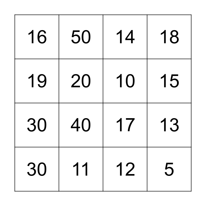 This bingo card has 16 words: 11, 13, 14, 16, 30, 50, 17, 12, 19, 20, 30, 18, 40, 15, 10 and 5.
