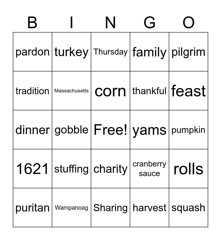 This bingo card has a free space and 34 words: thanksgiving, harvest, holiday, Plymouth, 1621, Massachusetts, pilgrim, puritan, turkey, mashed potatoes, corn, Thursday, football, gravy, yams, feast, Wampanoag, dinner, stuffing, cranberry sauce, charity, parade, pardon, pumpkin, Sharing, squash, family, November, thankful, tradition, pie, gobble, rolls and roast.