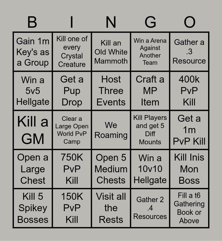 This bingo card has a free space and 24 words: 750K PvP Kill, 150K PvP Kill, Host Three Events, Kill 5 Spikey Bosses, Gather a .3 Resource, Gain 1m Key's as a Group, Win a 5v5 Hellgate, Kill one of every Crystal Creature, Kill Players and get 5 Diff Mounts, Open 5 Medium Chests, Craft a MP Item, Kill a GM, Win a 10v10 Hellgate, Kill Inis Mon Boss, Get a Pup Drop, Gather 2 .4 Resources, Get a 1m PvP Kill, Kill an Old White Mammoth, 400k PvP Kill, Clear a Large Open World PvP Camp, Fill a t6 Gathering Book or Above, Open a Large Chest, Win a Arena Against Another Team and Visit all the Rests.