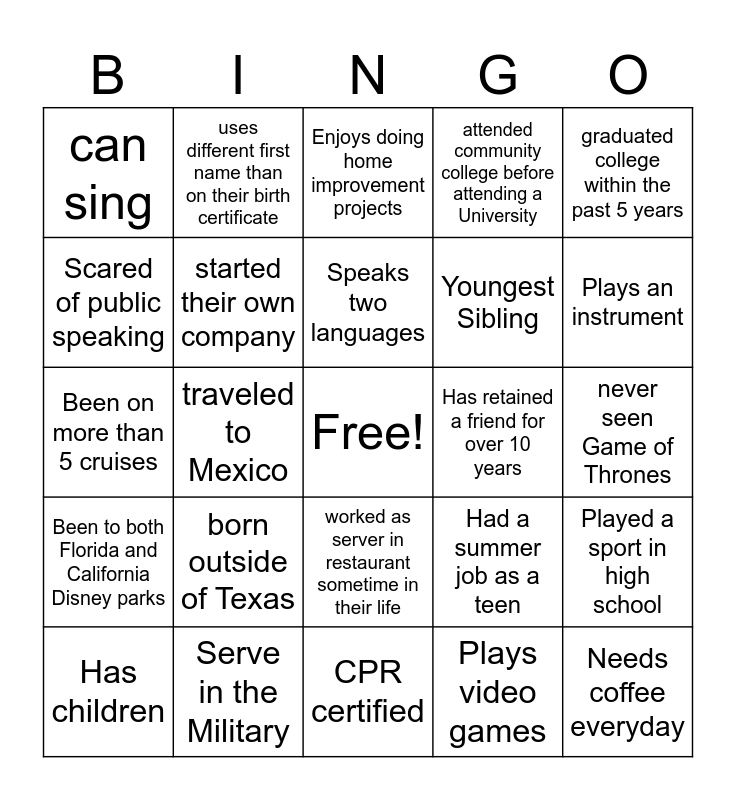 This bingo card has a free space and 29 words: Ever competed in a food contest, Serve in the Military, Enjoys doing home improvement projects, Has a pet (not a dog/cat), graduated college within the past 5 years, can sing, started their own company, Speaks two languages, Has retained a friend for over 10 years, Played a sport in high school, Has children, traveled to Mexico, Plays video games, Needs coffee everyday, Been on more than 5 cruises, Has clothes at the cleaners in need of pick up, CPR certified, Had a summer job as a teen, Plays an instrument, Been to both Florida and California Disney parks, born outside of Texas, Performed in a non-school play, Youngest Sibling, never seen Game of Thrones, Scared of public speaking, uses different first name than on their birth certificate, worked as server in restaurant sometime in their life, attended community college before attending a University and joined Fort Worth Chamber within the past 6 months.