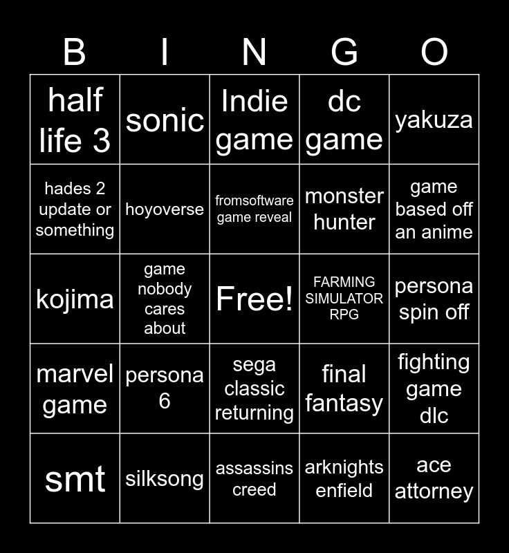 This bingo card has a free space and 24 words: persona 6, silksong, fromsoftware game reveal, smt, yakuza, half life 3, hades 2 update or something, sonic, FARMING SIMULATOR RPG, sega classic returning, monster hunter, kojima, final fantasy, fighting game dlc, hoyoverse, arknights enfield, persona spin off, Indie game, game based off an anime, game nobody cares about, ace attorney, marvel game, dc game and assassins creed.