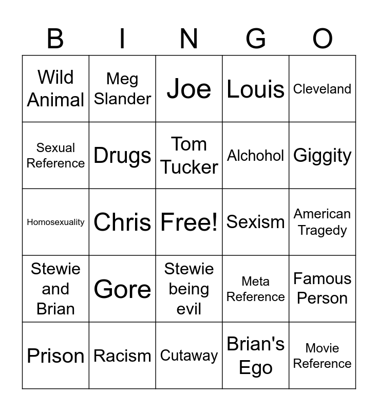This bingo card has a free space and 24 words: Gore, Racism, Tom Tucker, Prison, Cleveland, Wild Animal, Sexual Reference, Meg Slander, Sexism, Stewie being evil, Alchohol, Homosexuality, Meta Reference, Famous Person, Drugs, Brian's Ego, American Tragedy, Joe, Giggity, Chris, Movie Reference, Stewie and Brian, Louis and Cutaway.
