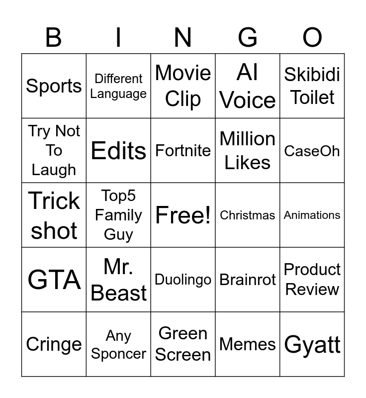This bingo card has a free space and 24 words: Mr. Beast, Any Sponcer, Fortnite, Cringe, Skibidi Toilet, Sports, Try Not To Laugh, Different Language, Christmas, Duolingo, Million Likes, Trick shot, Brainrot, Product Review, Edits, Memes, Animations, Movie Clip, CaseOh, Top5 Family Guy, Gyatt, GTA, AI Voice and Green Screen.