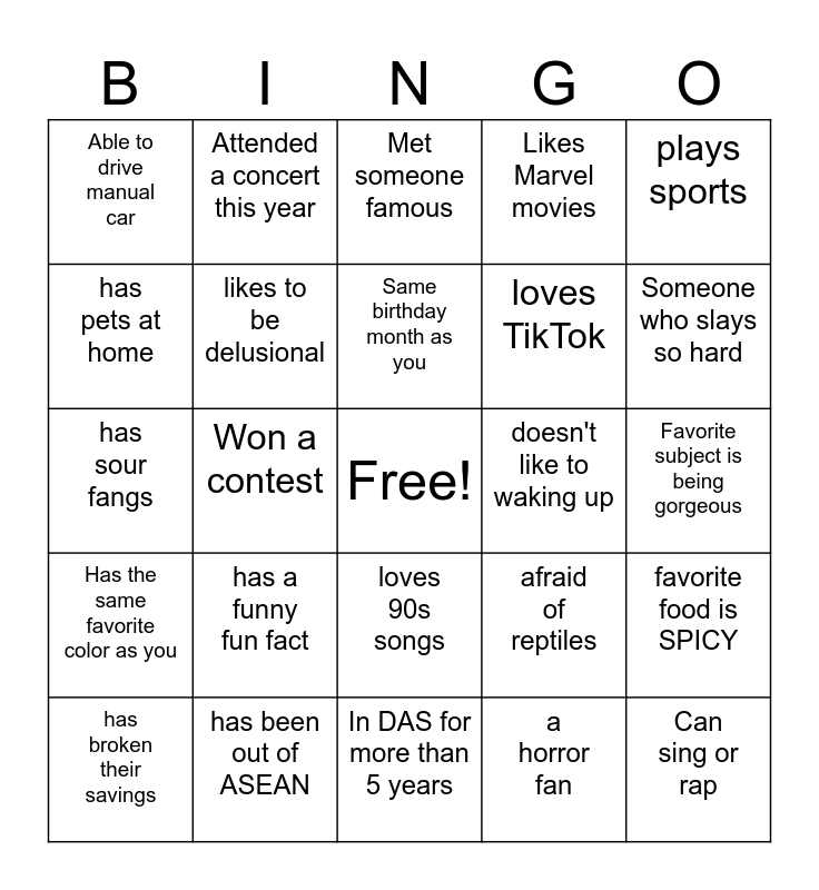 This bingo card has a free space and 24 words: has a funny fun fact, has been out of ASEAN, Same birthday month as you, has broken their savings, plays sports, Able to drive manual car, has pets at home, Attended a concert this year, doesn't like to waking up, loves 90s songs, loves TikTok, has sour fangs, afraid of reptiles, favorite food is SPICY, likes to be delusional, a horror fan, Favorite subject is being gorgeous, Met someone famous, Someone who slays so hard, Won a contest, Can sing or rap, Has the same favorite color as you, Likes Marvel movies and In DAS for more than 5 years.