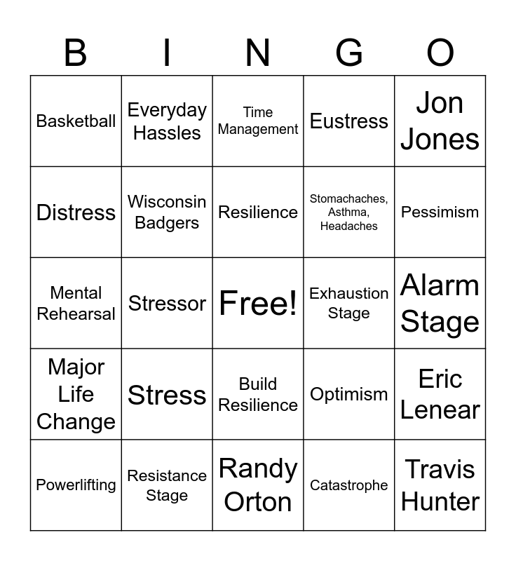 This bingo card has a free space and 24 words: Stress, Resistance Stage, Resilience, Powerlifting, Jon Jones, Basketball, Distress, Everyday Hassles, Exhaustion Stage, Build Resilience, Stomachaches, Asthma, Headaches, Mental Rehearsal, Optimism, Eric Lenear, Wisconsin Badgers, Catastrophe, Alarm Stage, Time Management, Pessimism, Stressor, Travis Hunter, Major Life Change, Eustress and Randy Orton.