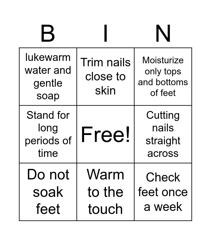 This bingo card has a free space and 11 words: Red, discharge, swollen, Importance of inspecting feet, Cutting nails straight across, Do not soak feet, Moisturize only tops and bottoms of feet, lukewarm water and gentle soap, Warm to the touch, Do not soak feet, Stand for long periods of time, Trim nails close to skin and Check feet once a week.