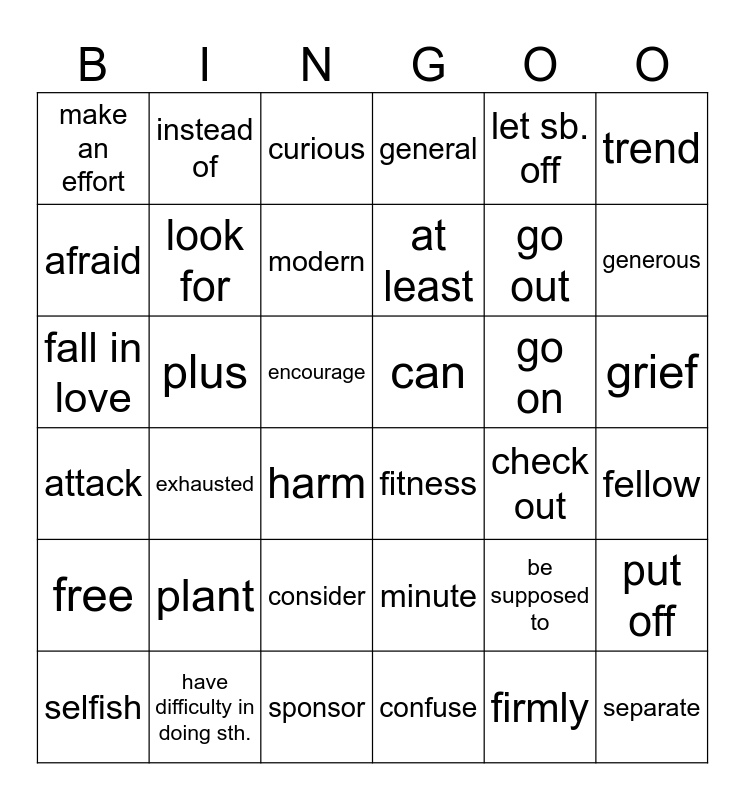 This bingo card has 36 words: minute, consider, confuse, afraid, attack, can, look for, sponsor, let sb. off, be supposed to, generous, general, put off, plus, at least, make an effort, free, go on, fall in love, curious, encourage, exhausted, fitness, harm, check out, instead of, go out, have difficulty in doing sth., modern, trend, separate, selfish, fellow, grief, plant and firmly.