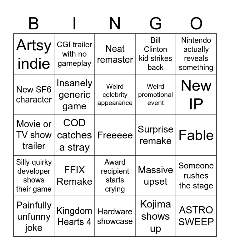 This bingo card has a free space and 24 words: FFIX Remake, Kingdom Hearts 4, Weird celebrity appearance, Painfully unfunny joke, Nintendo actually reveals something, Artsy indie, New SF6 character, CGI trailer with no gameplay, Surprise remake, Award recipient starts crying, Weird promotional event, Movie or TV show trailer, Massive upset, Someone rushes the stage, Insanely generic game, Kojima shows up, Fable, Neat remaster, New IP, COD catches a stray, ASTRO SWEEP, Silly quirky developer shows their game, Bill Clinton kid strikes back and Hardware showcase.