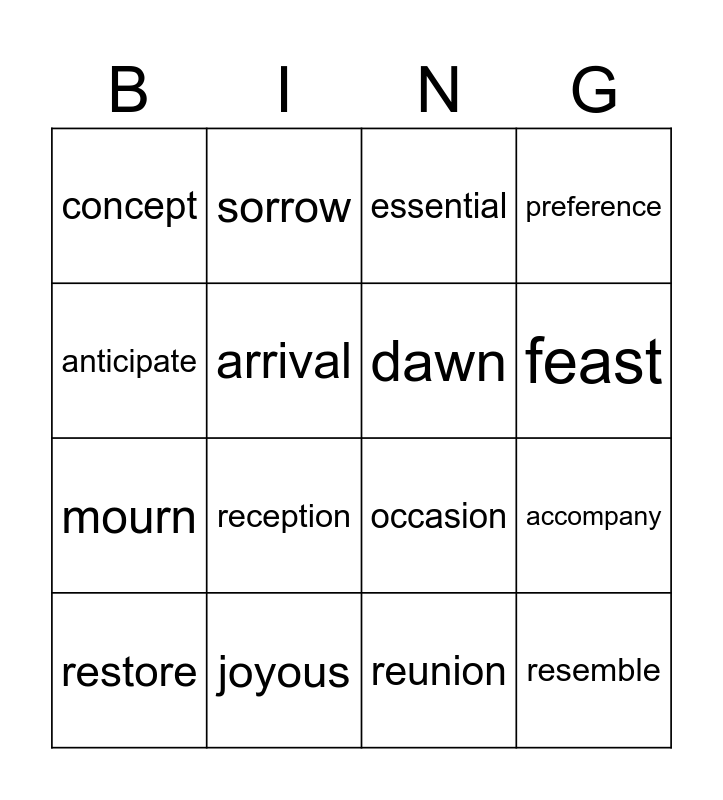 This bingo card has 16 words: joyous, accompany, essential, concept, mourn, sorrow, occasion, reunion, anticipate, arrival, restore, preference, reception, feast, dawn and resemble.