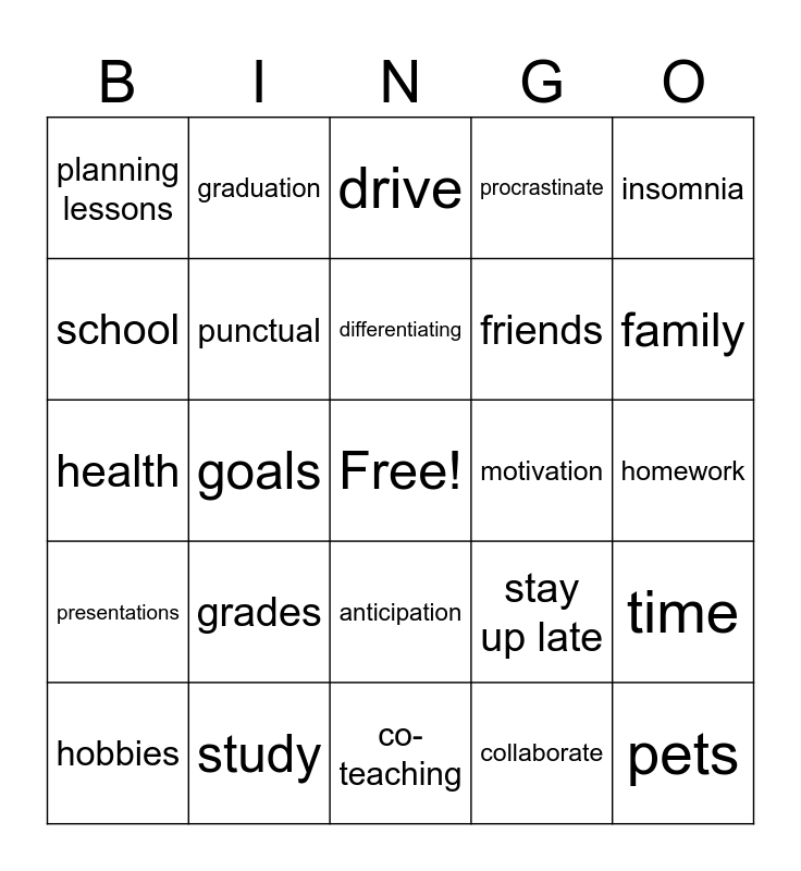 This bingo card has a free space and 24 words: grades, study, differentiating, hobbies, insomnia, planning lessons, school, graduation, motivation, anticipation, friends, health, stay up late, time, punctual, collaborate, homework, drive, family, goals, pets, presentations, procrastinate and co-teaching.
