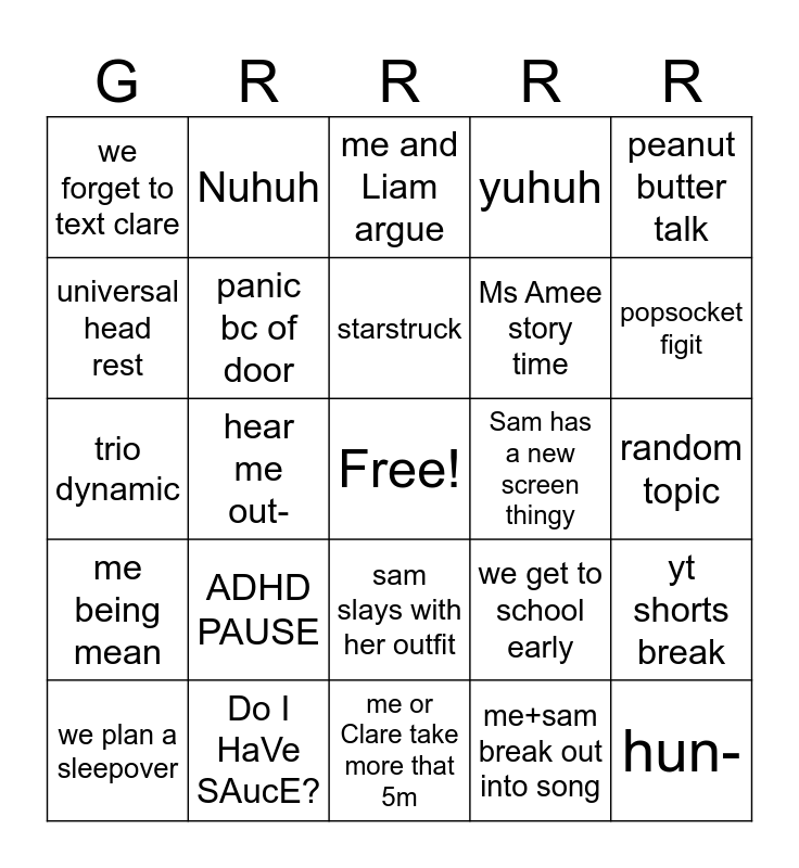 This bingo card has a free space and 24 words: ADHD PAUSE, Do I HaVe SAucE?, starstruck, we plan a sleepover, peanut butter talk, we forget to text clare, universal head rest, Nuhuh, Sam has a new screen thingy, sam slays with her outfit, Ms Amee story time, trio dynamic, we get to school early, yt shorts break, panic bc of door, me+sam break out into song, random topic, me and Liam argue, popsocket figit, hear me out-, hun-, me being mean, yuhuh and me or Clare take more that 5m.