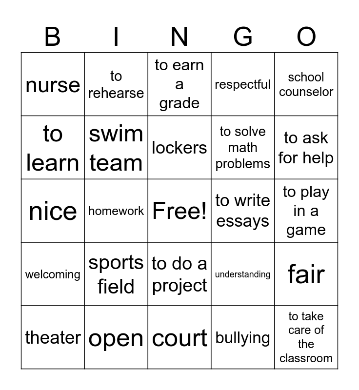This bingo card has a free space and 25 words: sports field, court, lockers, theater, school counselor, nurse, to learn, to rehearse, to write essays, to do a project, to solve math problems, nice, understanding, fair, swim team, to do track, to play in a game, to earn a grade, to ask for help, homework, to take care of the classroom, open, welcoming, respectful and bullying.