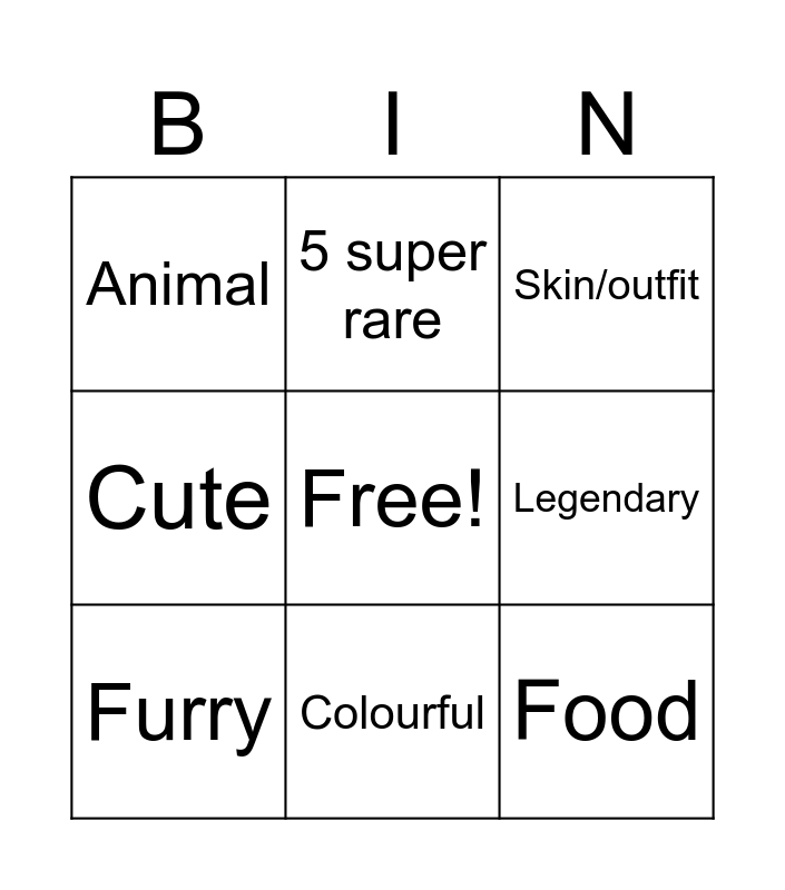 This bingo card has a free space and 8 words: Legendary, Skin/outfit, 5 super rare, Furry, Animal, Food, Cute and Colourful.
