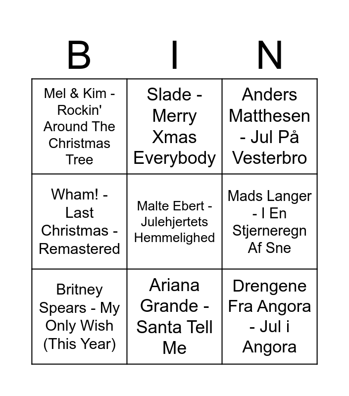 This bingo card has 35 words: Free!, Shakin' Stevens - Merry Christmas Everyone, Juice - Let Love Be Love, Britney Spears - My Only Wish (This Year), Mariah Carey - All I Want for Christmas Is You, Wham! - Last Christmas - Remastered, Mads Langer - I En Stjerneregn Af Sne, Chris Rea - Driving Home for Christmas, Ariana Grande - Santa Tell Me, Justin Bieber - Mistletoe, Hjalmer - Kongespil, Malte Ebert - Julehjertets Hemmelighed, Burhan G - Tinka, Julie - Jesus & Josefine, Mel & Kim - Rockin' Around The Christmas Tree, Dean Martin - Let It Snow! Let It Snow! Let It Snow!, Sia - Snowman, Lukas Graham - HERE (For Christmas), The Ronettes - Sleigh Ride, Shu-Bi-Dua - Den Himmelblå, Ed Sheeran - Merry Christmas, Band Aid - Do They Know It's Christmas?, Queen - Thank God It's Christmas, John Lennon - Happy Xmas (War Is Over), Anders Matthesen - Jul På Vesterbro, Brenda Lee - Rockin' Around The Christmas Tree, Kelly Clarkson - Underneath the Tree, Dicte - Drømte Mig En Lille Drøm, Drengene Fra Angora - Jul i Angora, Søs Fenger - Ludvig Og Julemanden, De Nattergale - It's Hard to Be a Nissemand, Train - Shake Up Christmas, Oh Land - Julefeber, Slade - Merry Xmas Everybody and Sia - Santa's Coming for Us.