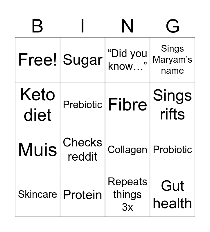 This bingo card has 16 words: Skincare, Protein, “Did you know…”, Sings Maryam’s name, Keto diet, Sugar, Collagen, Probiotic, Free!, Prebiotic, Repeats things 3x, Sings rifts, Muis, Checks reddit, Fibre and Gut health.