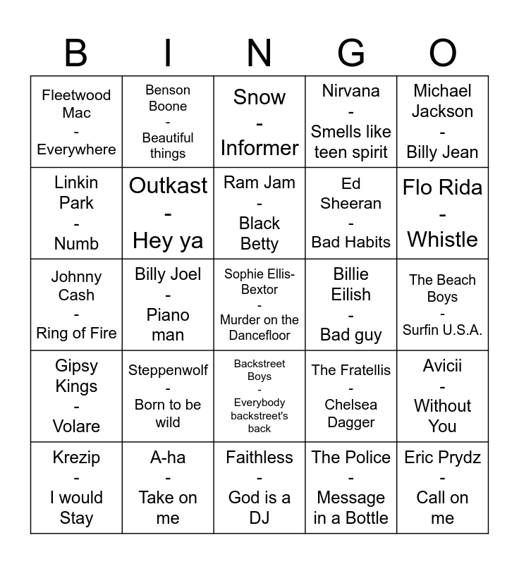 This bingo card has 41 words: Elvis Presley - A little less conversation, Johnny Cash - Ring of Fire, Earth Wind & Fire - September, Outkast - Hey ya, A-ha - Take on me, Backstreet Boys - Everybody backstreet's back, Ram Jam - Black Betty, Culture Beat - Mister Vain, Michael Jackson - Billy Jean, Gipsy Kings - Volare, Billy Joel - Piano man, Nirvana - Smells like teen spirit, Sophie Ellis-Bextor - Murder on the Dancefloor, The Beach Boys - Surfin U.S.A., Billie Eilish - Bad guy, Steppenwolf - Born to be wild, Dire Straits - Walk of life, Fleetwood Mac - Everywhere, Alicia Keys - Fallin, Snow - Informer, Avicii - Without You, Eric Prydz - Call on me, Faithless - God is a DJ, Ed Sheeran - Bad Habits, The Champs - Tequila, Owl City - Fire Flies, The Police - Message in a Bottle, Cyndi Laupher - Time after Time, Flo Rida - Whistle, Loreen - Tattoo, Within Temptation - Ice queen, Benson Boone - Beautiful things, Krezip - I would Stay, Wet Wet Wet - Love is all around, The Fratellis - Chelsea Dagger, Linkin Park - Numb, Nakatomi - Children of the Night, Boney M - Rasputin, Guns N Roses - Paradise City, Blink 182 - All the small things and The Cranberries - Zombie.